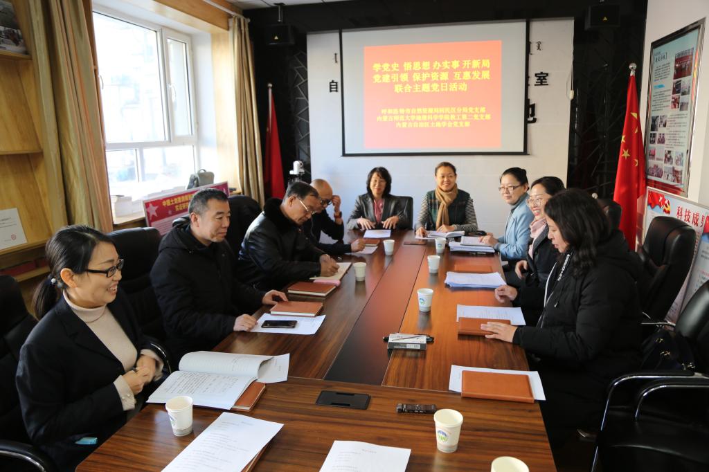 2021年12月17日上午,bat365在线平台官网教工第二党支部与内蒙古自治区土地学会党支部、呼和浩特市自然资源局回民区分局党支部,在内蒙古自治区国土空间规划院东楼201室,联合开展了以“学党史、悟思想、办实事、开新局——党建引领,保护自然资源,互惠发展”为主题的联合主题党日活动。